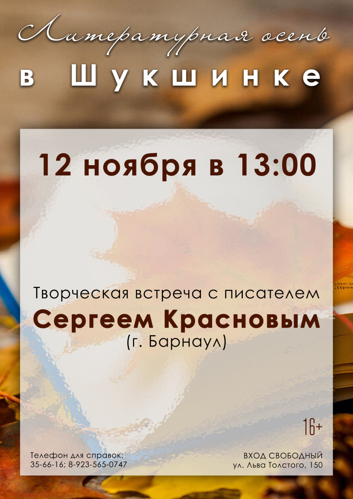 Творческая встреча с писателем С. Красновым (г. Барнаул) (16+) (Центральная городская библиотека им. В. М. Шукшина, ул. Л.Толстого,150)