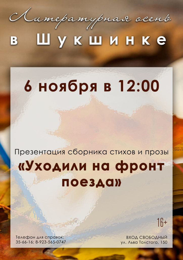 Презентация сборника стихов и прозы «Уходили на фронт поезда» (16+) (Центральная городская библиотека имени В. М. Шукшина, ул. Л. Толстого, 150)